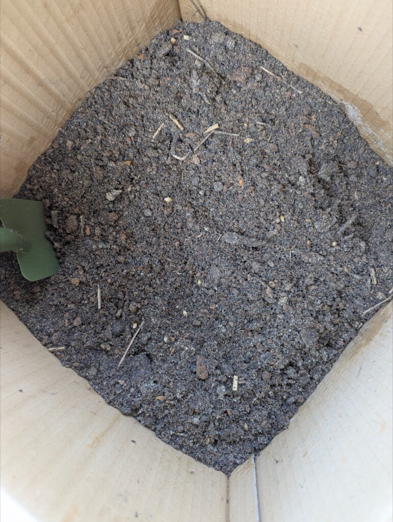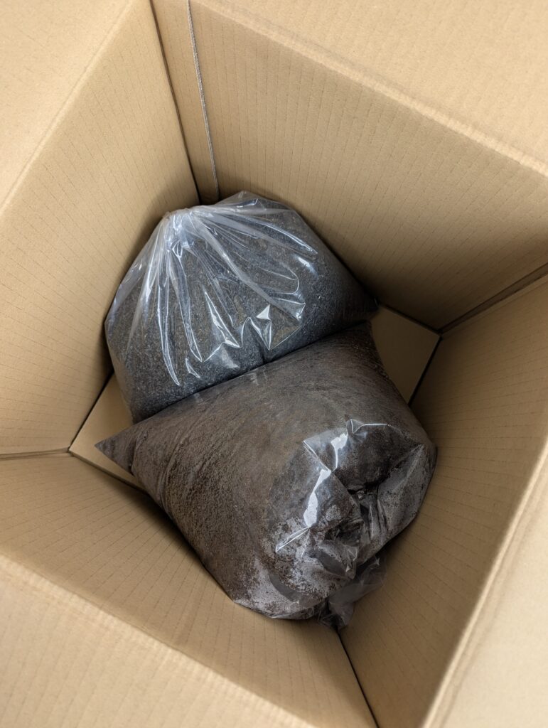 段ボールの大きさは35×35センチ もみ殻燻炭とピートモス合わせて約2.6キロあります。専用のスコップ1つあると便利です🙂
